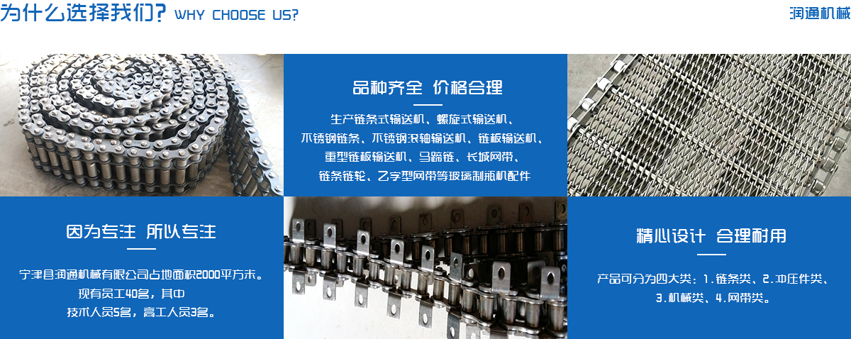 生產(chǎn)鏈條式輸送機、螺旋式輸送機、不銹鋼鏈條、不銹鋼滾軸輸送機、鏈板輸送機、重型鏈板輸送機、馬蹄鏈、長城網(wǎng)帶、鏈條鏈輪、乙字型網(wǎng)帶等玻璃制瓶機配件,食品機械配件及各種網(wǎng)帶的專業(yè)廠家 ,多年來產(chǎn)品暢銷各地玻璃廠和食品廠,在玻璃制品等行業(yè)中享有較高的聲譽。公司集摸具開發(fā)、機械設計生產(chǎn),銷售于一體的生產(chǎn)型企業(yè)。生產(chǎn)的自動化流水線金屬傳動網(wǎng)帶、鏈條等產(chǎn)品廣泛用于玻璃機械、食品機械、化纖機械、醫(yī)藥、電子、烘干機械、輪胎機械等行業(yè)。產(chǎn)品多銷往各個城市的機械廠、食品廠和一些涉及流水線或自動化設備的公司。